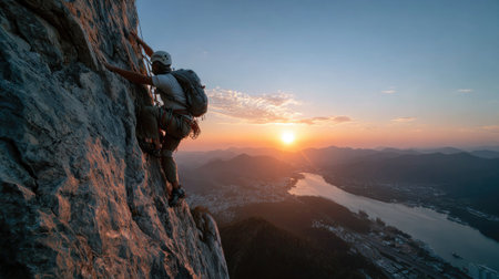 A determined climber scales a rocky cliff at sunrise, showcasing the thrill of adventure against a breathtaking natural backdrop with safety gear.