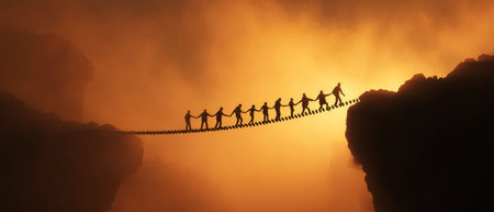 A group of people holds hands and walks together on a rope bridge over a canyon filled with fog, showing teamwork and perseverance during sunset.