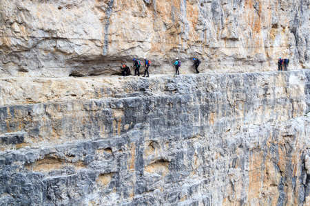 People climbing on via ferrata Sentiero delle Bocchette Centrale in Brenta Dolomites mountains, Italy