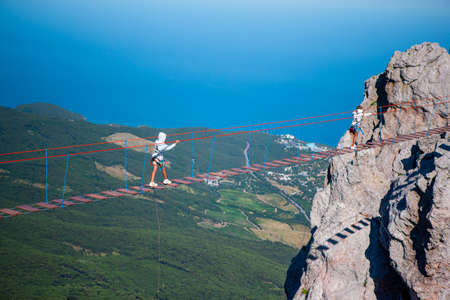 Russia, Crimea, 3 july 2017. Man walking on the rope on long hanging bridge over the abyss