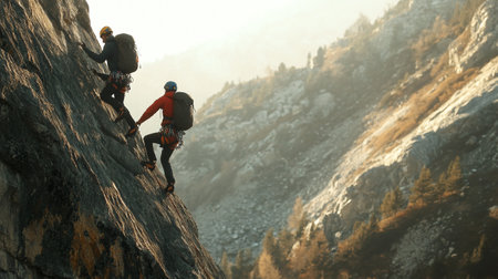 Two equipped rock climbers ascending challenging vertical rocky wall. Generative AI