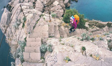 A woman descends the steps from the top of the mountain. A girl with a backpack climbs. Ladder on the rock. Active lifestyle. Woman on a background of sea coast. Beautiful view of the mountains.
