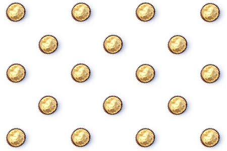 On a white isolated background a pattern of round candies in a gold package. Top view, close-up. Lettering substrate, postcard.
