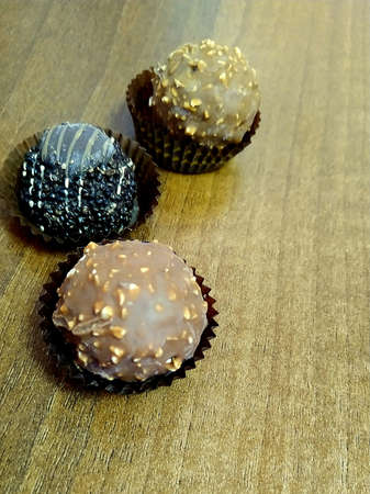 Sweet chocolate truffles. Tasty belgian pralines balls on kitchen table.
