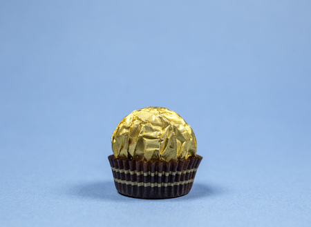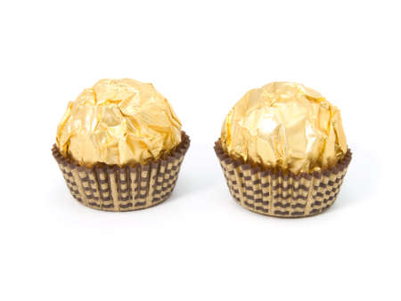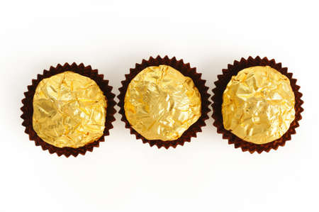 Sweet chocolate ball wrapped in golden foil isolated on white background.