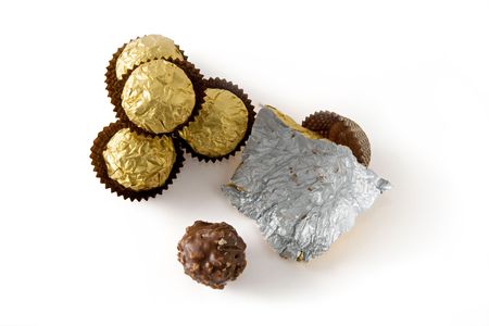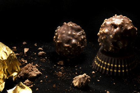 Select focus of wrapped and unwrapped chocolate and hazelnut sweets. Chocolate and abstract concept