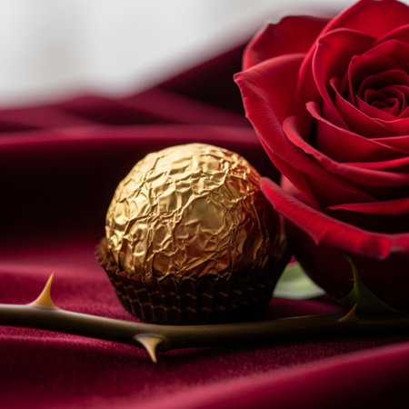 A hand reaches for golden chocolates, surrounded by festive elements, suggesting a holiday treat.