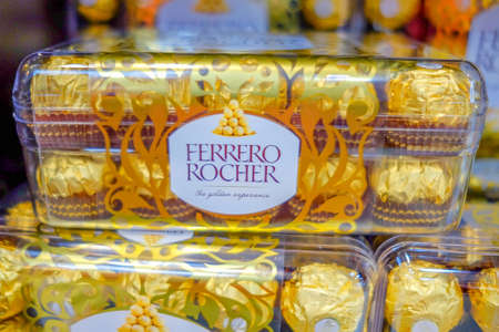 Tyumen, Russia-November 07, 2020: Ferrero Rocher candies, a famous chocolate candies on shelves. Ferrero Rocher is a famous brand of candies.