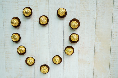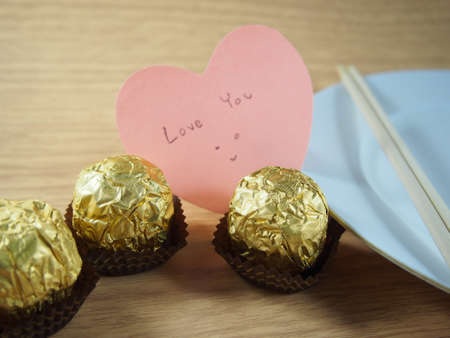 Milk chocolate balls, covered golden paper, telling love you heart shape of paper background