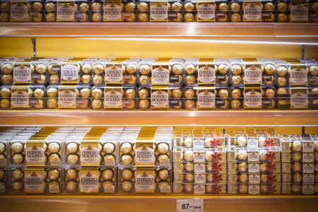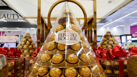 BANGKOK, THAILAND - DECEMBER 14, 2017: Ferrero Rocher, a chocolate and hazelnut confectionery that are arranged for sale during New Year holidays at Big C Supermarket