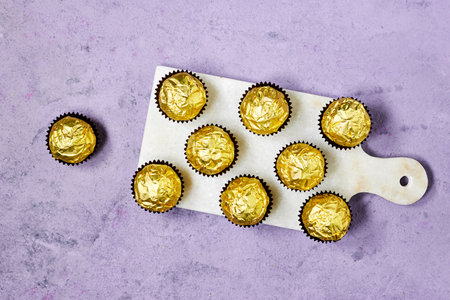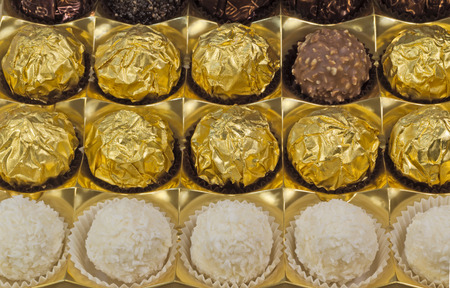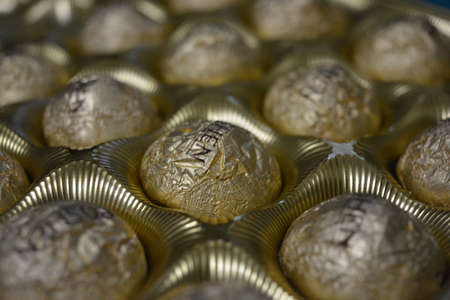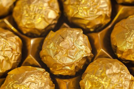 Box of round candies wrapped into golden foil. Macro shot. Luxury food.
