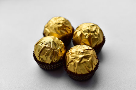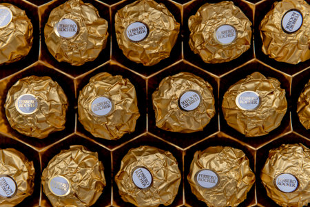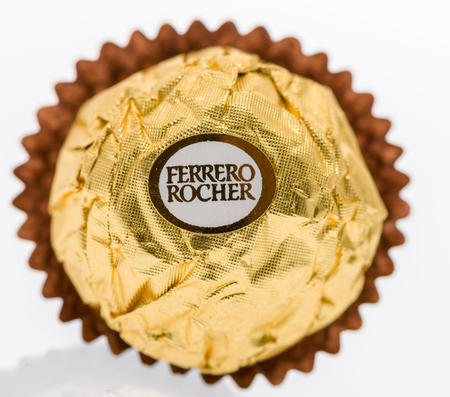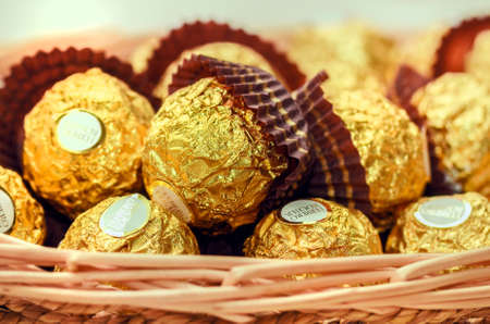 Pretty Ferrero Rocher candy in gold cover for editorial use