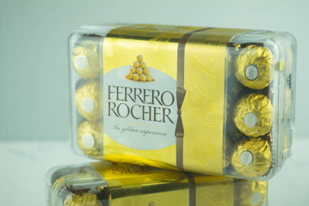 Bangkok, Thailand - September 21, 2020 : Ferrero Rocher - round chocolates. Candy in branded packaging, a sweet pleasure for every body.