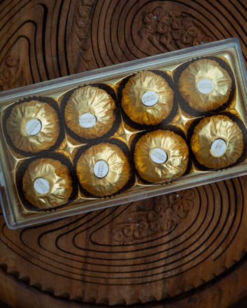 Kuala Lumpur, Malaysia - May 16, 2020: Ferrero Rocher premium chocolate sweets on wooden background. Luxury taste.