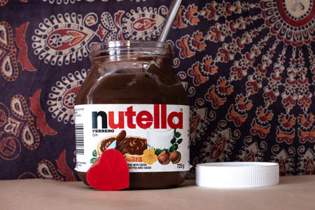 Toronto, Ontario, Canada - February 4 2021: A jar of Nutella, a hazel nut spread, in front of a mandala tapestry. February 5 2021 is World Nutella Day.