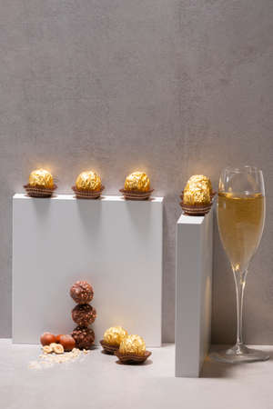 Arrangement of golden wrapped and unwrapped chocolate and hazelnut sweets and a glass of champagne. Chocolate confectionery and abstract concept.