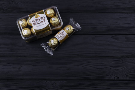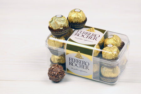 KHARKIV, UKRAINE - JANUARY 2, 2021 Ferrero Rocher - round chocolates. Candy in branded packaging, a sweet pleasure for children and adults