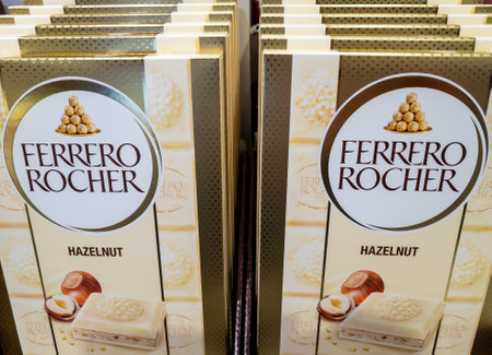 Samara, Russia - September 26, 2019: Ferrero Rocher chocolate on store shelf