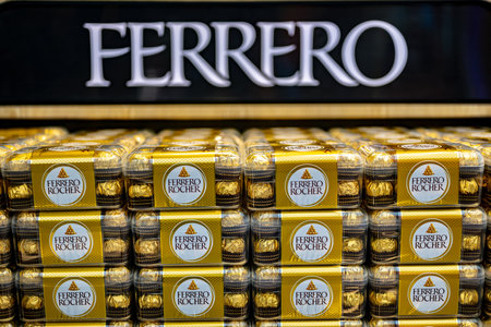 Charleroi, Belgium - December 28 2019: Ferrero Rocher chocolate pralines with hazelnut