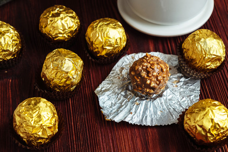 Golden Chocolate Ball, Luxury Chocolate Snack on the Wood Table for Relax Time.