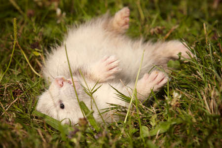 Ferret albino male in summer grass enjoying their walk and game in park
