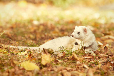 Light fur ferret relexing in autumn leaves in park