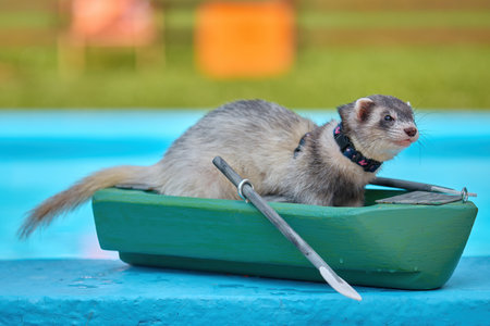 Cute dark color ferret riding a small boat on swimming pool