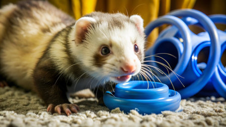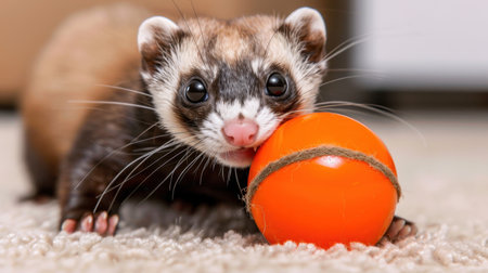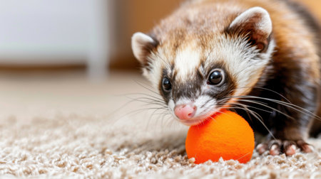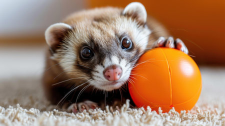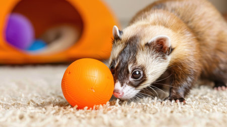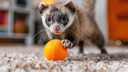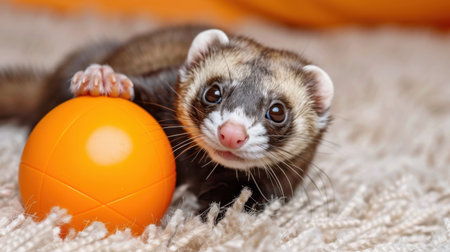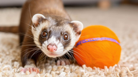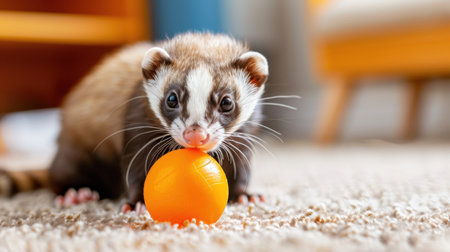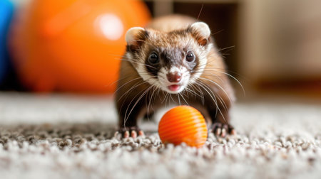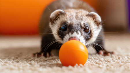 Cute ferret sitting on the carpet and playing with colorful ball