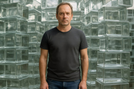 Confident mature man standing in front of a wall made of stacked glass blocks, creating an interesting architectural background