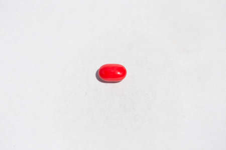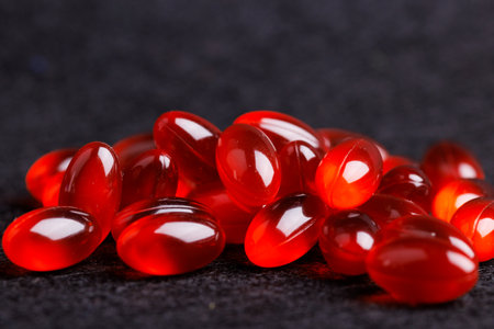A detailed view of red transparent pills on a black background, highlighting their sleek design and vibrant color, perfect for health-related themes