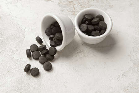 Closeup scattered white medicine vitamins, pills, drugs on gray background. White food dietary supplement. Black and white photography. Top view
