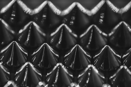 Close-up macro of sewing studs arranged in symmetrical rows in black and white abstraction