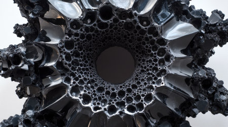 Organic structure with circular hole at center, composed of smooth, reflective surfaces and intricate textured patterns, displaying contrast between glossy areas and shadowy depths