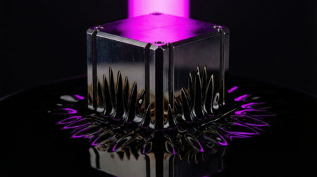 AI Generated. Close-up view of ferrofluid spikes illuminated by neon light, showcasing magnetic properties