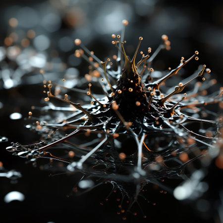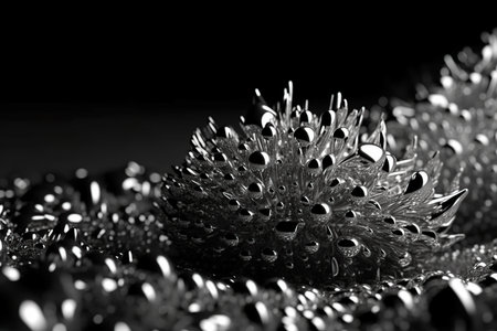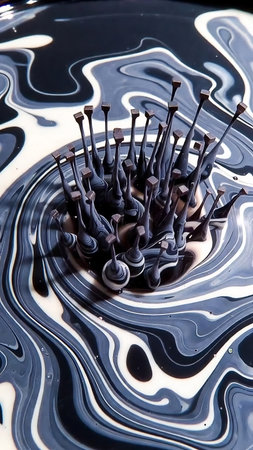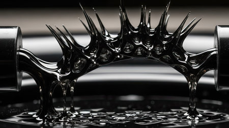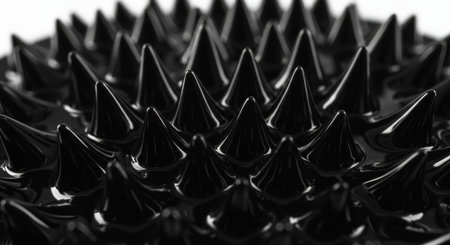 An artistic close-up reveals a ferrofluid responding to unseen magnetic forces. The dark liquid forms intricate, spiky structures between cylindrical elements. The image displays a high-contrast style with glossy textures and a shallow depth of field, hinting at scientific applications or artistic concepts. This image could be utilized for various commercial and editorial projects.