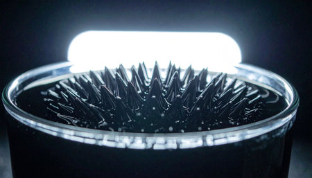 In a dark laboratory setting, a mysterious black liquid known as ferrofluid comes to life.