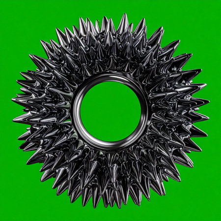 A futuristic 3D render of a spiky metallic ring, resembling a magnetic ferrofluid structure, isolated on a vibrant green screen.