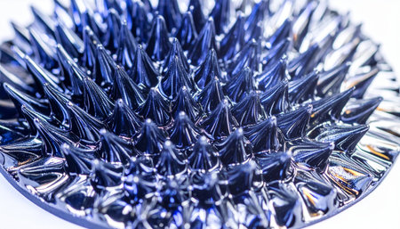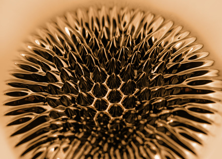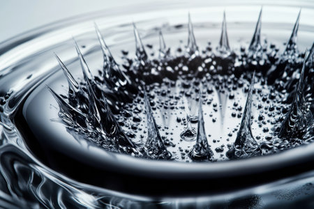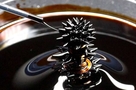 A close up macro view of magnetic fluid spikes on a dark background, showcasing a science experiment and the beauty of physics in action.