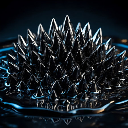 A stunning abstract image capturing the unique, otherworldly patterns of ferrofluid under magnetic influence. The sharp, glossy spikes create a powerful and futuristic background