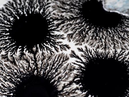 Bacteria under a microscope. A colony of microbes under a stereomicroscope. Close-up of black and white bacteria cells in a scientific laboratory.