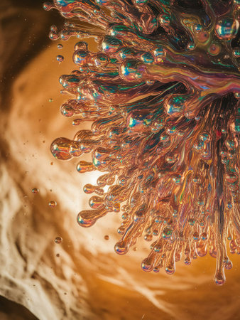 Close-up shot of water droplets, showcasing intricate details and vibrant colors, forming an abstract pattern.