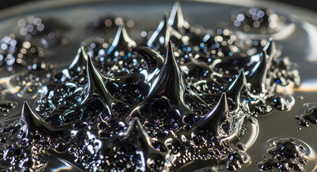 A macro photograph captures the mesmerizing and dynamic shapes of a black ferrofluid responding to a magnetic field. The shiny, viscous liquid forms sharp spikes and peaks, illustrating concepts in physics, magnetism, and nanotechnology.