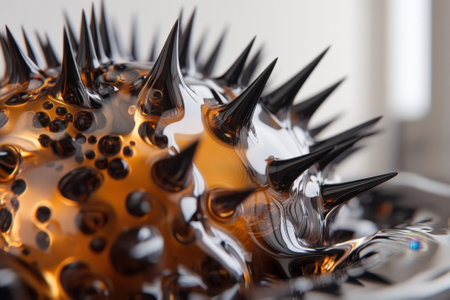 An artistic representation shows a metallic sphere covered in sharp, pointed protrusions. The object, rendered with a gradient effect, is set against a plain, neutral background, emphasizing its texture and form. This image is suitable for a variety of uses, including graphic design, educational materials, and conceptual art projects.