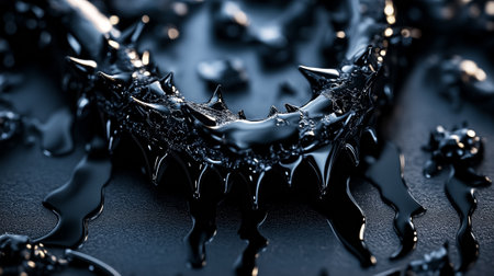 Sharp-edged dark scales drip thick black substance, creating a striking and unsettling look on a flat surface.