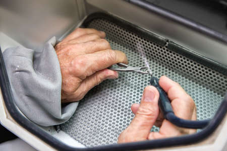 Old men hands working with with tooth prosthesis in a dental sandblaster. Close view.