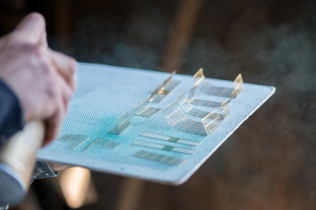 Miniature windows and grills suited for scale model buildings being spray-painted with blue green primer