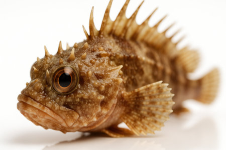 Scorpionfish extreme macro diagonal portrait focusing on eye dorsal spine bases and granular skin on white