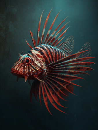 A detailed close-up of a venomous lionfish, showcasing its distinctive fins and patterned scales against a moody, dark background