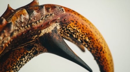 Asian forest scorpion tail tip macro on white background showing curved aculeus and textured telson for venom danger wildlife and toxin themes