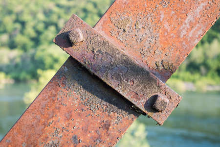 Detail of a rusty bridge girder. It has a worn and weathered appearance. The rusted metal is covered in dirt and debris, giving it a sense of abandonment and decay